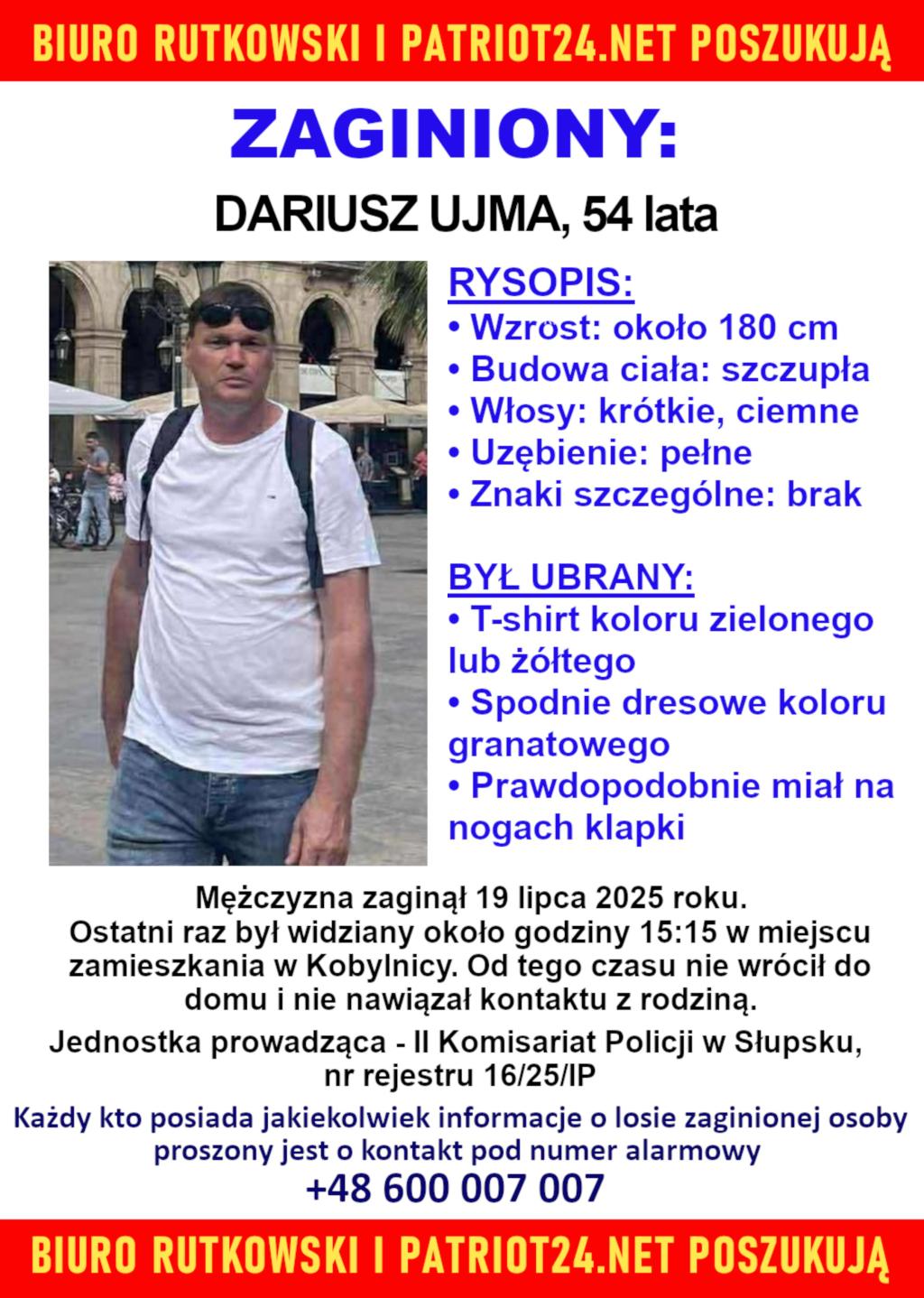 Biuro Rutkowski i Telewizja.Patriot24.net organizują briefing prasowy dotyczący zaginionego w dniu 19 lipca b. r. mieszkańca Kobylnicy, Dariusza Ujmy.