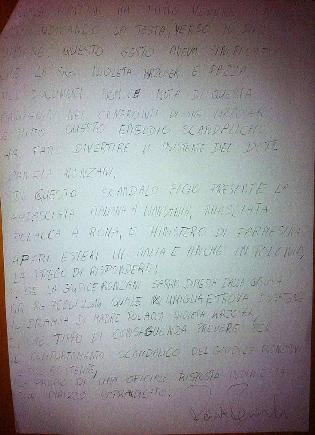 W naszym piśmie domagamy się też udzielenia odpowiedzi na pytanie czy Presidente Dott. Aurelio Gatto dopuści sędzię Danielę Ronzani do dalszego rozsądzania tej niebezpiecznej dla polskiego dziecka sprawy. I dlaczego uznała Wioletę Wrzosek za osobę z problemami psychicznymi, skoro w aktach prowadzonej przez nią sprawy o sygn. akt: RG 7600/2014 nie ma żadnego dowodu na to, że matka dziecka ma jakiekolwiek problemy natury psychologicznej czy psychicznej!